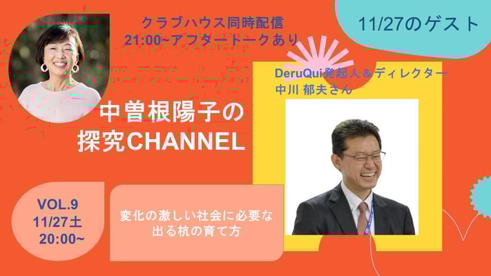 次回VOL.9は、11月27日(土)20時から、とんがった学生(出る杭)の発掘と成長支援、縁作りを行うDeruQui発起人でディレクターの中川郁夫さんをゲストにお迎えします。