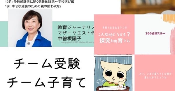 オンラインサロンメンバー限定の月1回の講座、中曽根からの最新の教育情報や特別ゲストとのオンラインサロン限定の対談、受験経験者の体験談なども交え、あなたとお子さんの幸せな受験に伴走します。(チーム受験は、一人ひとりの受験にコミットしていくため、人数制限を設けております)