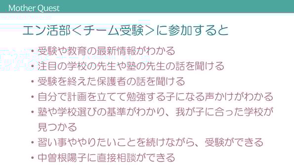 大学入試だけでなく、中学入試でも思考力型やプレゼン型の入試が増えています。教育の最新情報を知り、学校の選び方を学び、我が家で大事にしたい軸を明確にして、子どもも応援しながら自分も整える。そんな場所が、マザークエスト オンラインサロン「エン活部」<チーム受験>です。