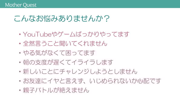今まで幼稚園や小中学校からご依頼をいただき保護者の方向けに講演させていただいているのですが、毎回とても嬉しい感想をたくさん頂いています。せっかくなので、広くみなさまに聴いていただければと思い、マザークエスト主催で開催することにしました。