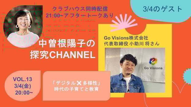 今回は、子ども一人ひとりの「好き!やりたい!」から未来につながる力を育むオンライン習い事SOZOWを運営するGo Visions株式会社 代表取締役の小助川将さんをゲストにお迎えした2022年3月4日のVOL.13のお話をリポートします。