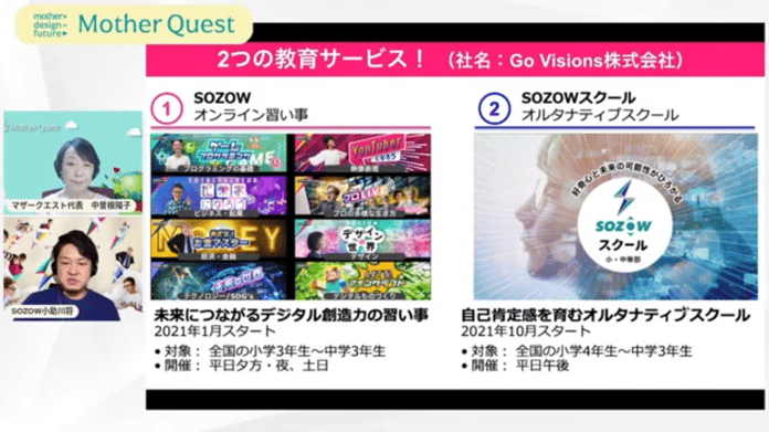 SOZOWでは、オンライン習い事とオルタナティブスクールの2つを運営しています。