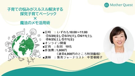 トークイベントのタイトルは、「いま、教育で一番大事な「探究力」の育て方」。マザークエスト代表の中曽根陽子は「家庭でこそ探究を!」と皆様にお伝えしてきました。そして、この度「このメモ術があれば、簡単に家庭で探究に取り組める! とっても良いから皆様にぜひ伝えたい!」と一念発起し、インストラクターになりました。